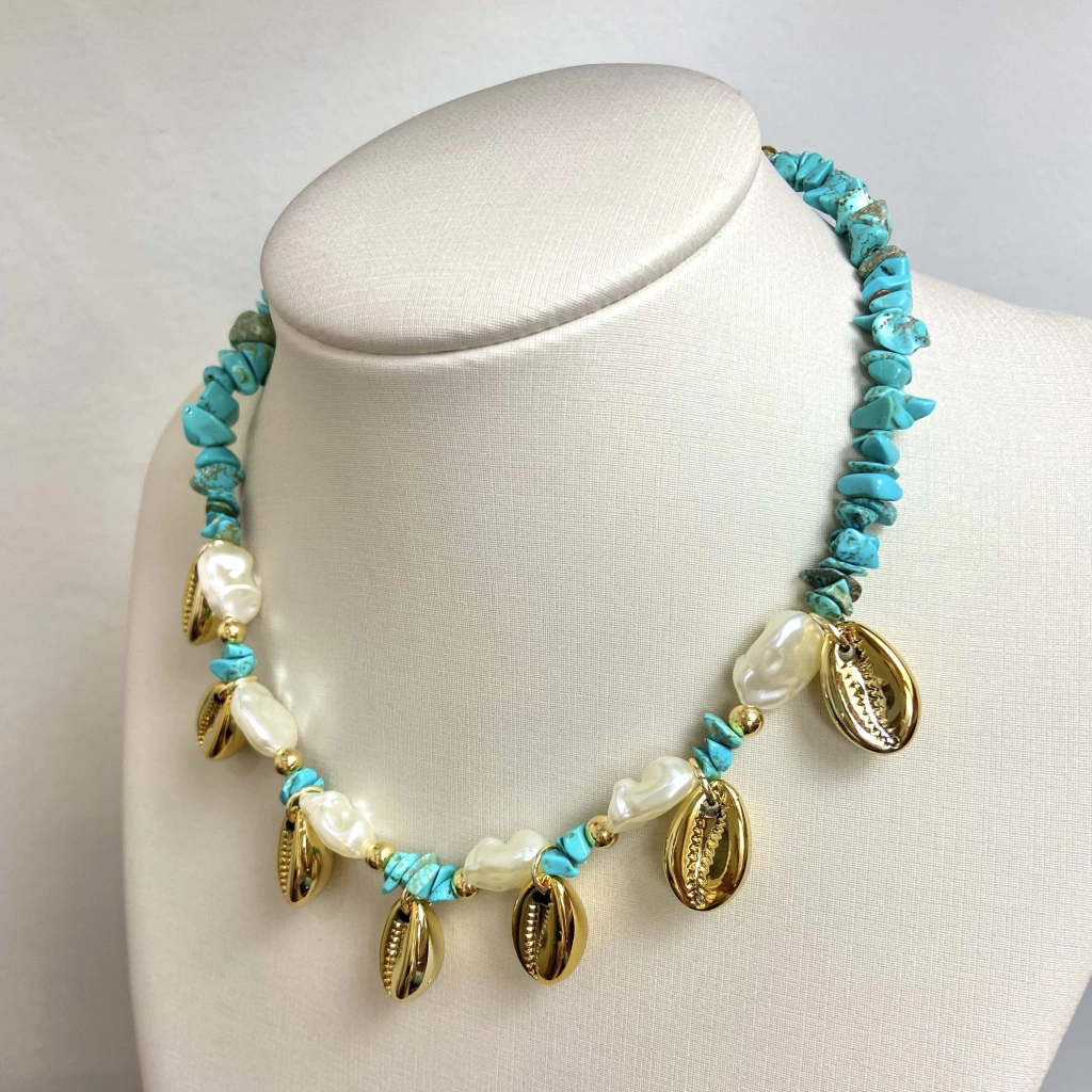 Colar de pedrinhas vermelhas, amarelas, azuis ou marrons com búzios dourados.