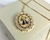 Colar dourado com ródio, oval com pingente de Nossa Senhora Aparecida, adornado e cravejado com zircônias azuis e brilhantes.