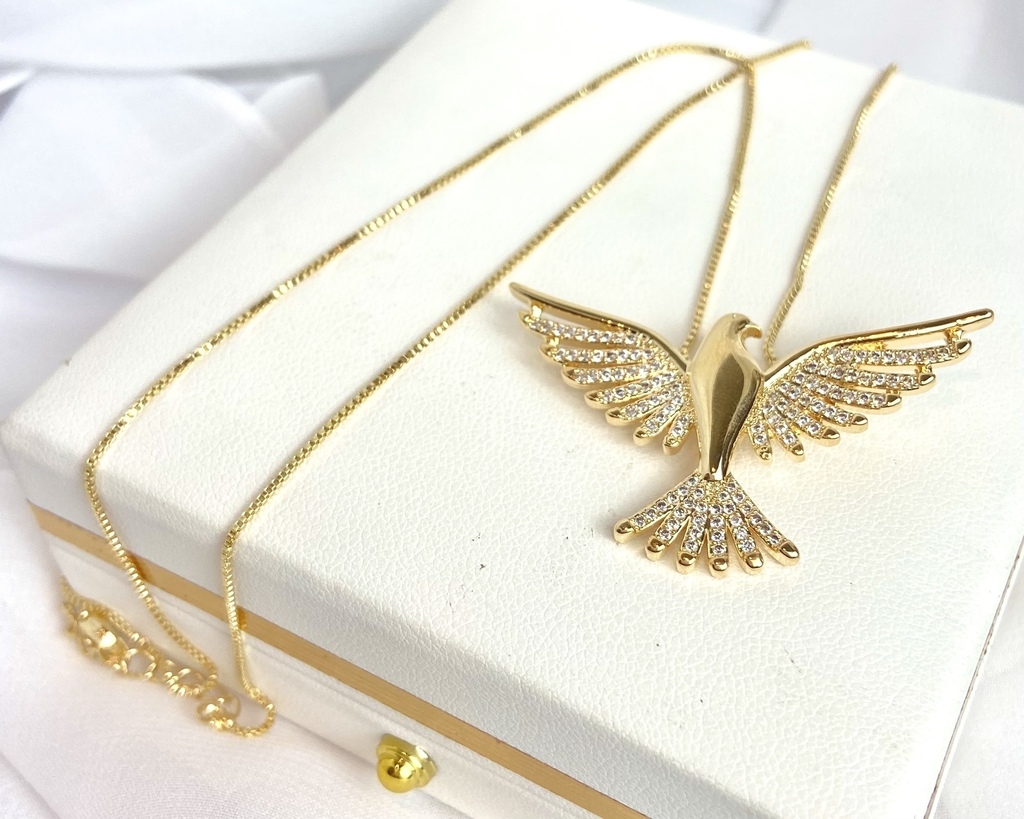 Colar de corrente dourada, pingente da Pomba da Paz dourada e detalhes nas penas cravejados por zircônia.