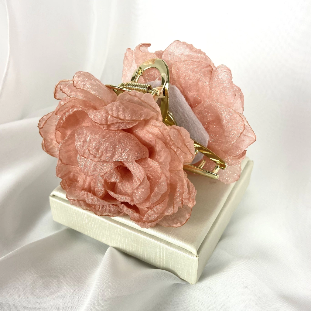 Prendedor de cabelo em forma de rosa, na cor rosa claro, lilás e preto.